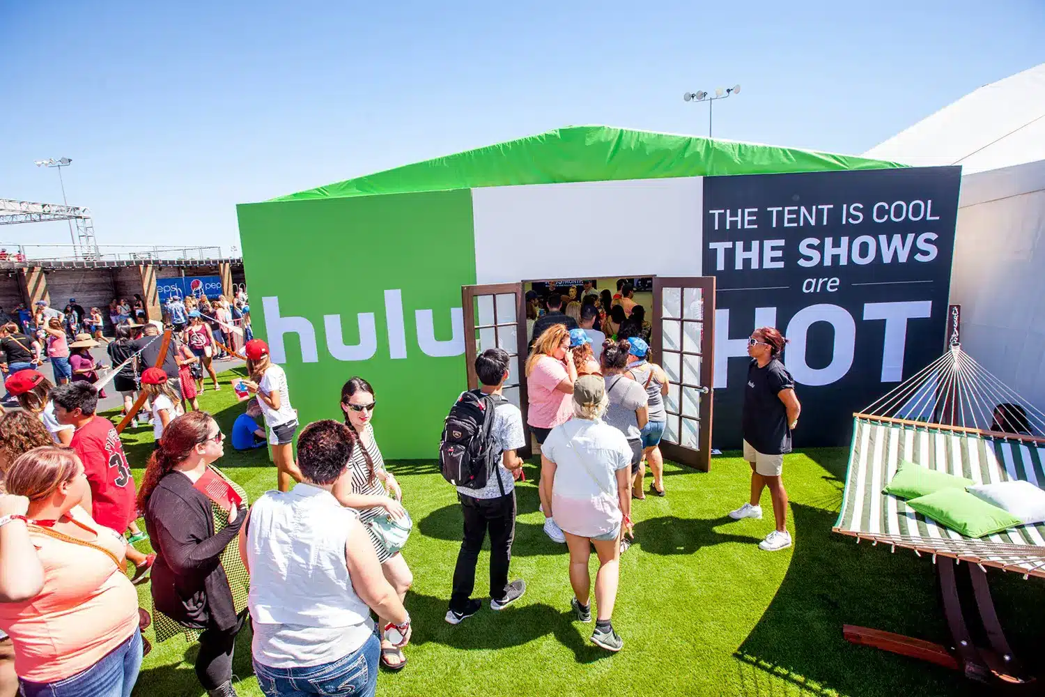 Outside the tent guests lounged in green and white hammocks, posed for HuluHeartsTV selfies and added their favorite show titles to the Hulu Tell and Tag wall.